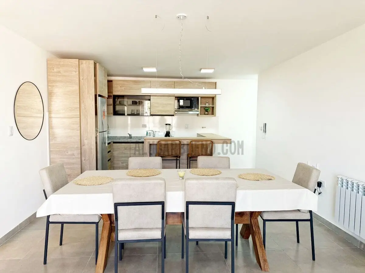 El departamento en segundo piso contrafrente,con vistas a las sierras,Posee living comedor con aire acondicionado, radiadores, tv, muebles de cocina modernos equipado con vajilla completa, cubiertos, asaderas, fuentes, microondas, pava, heladera, cocina con horno, lavarropas.
