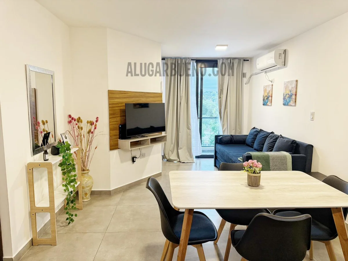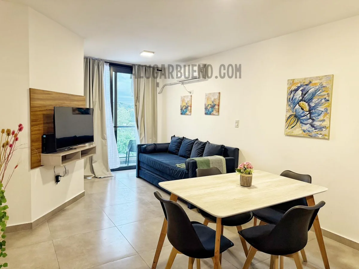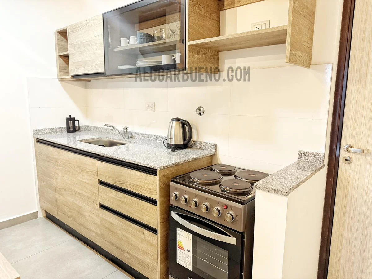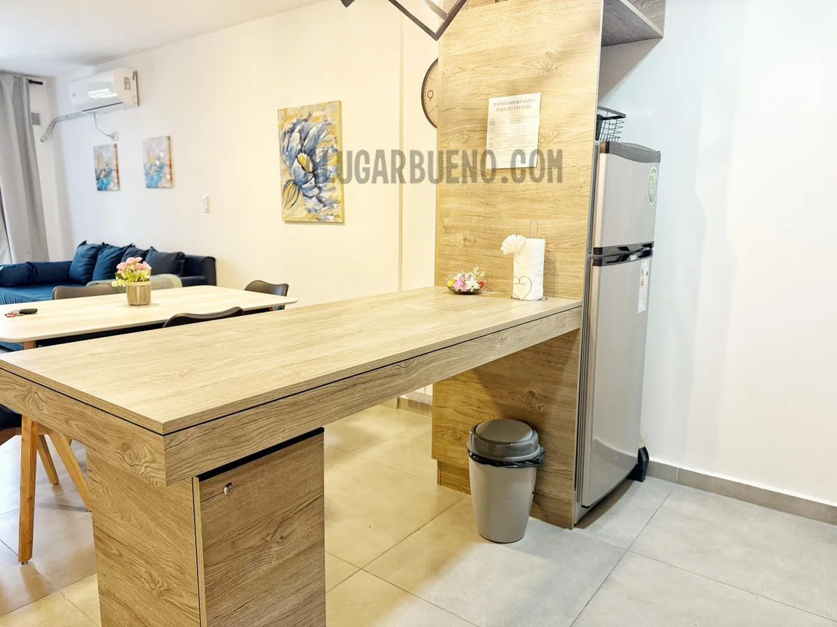 El departamento está ubicado en segundo piso con vistas a la ciudad. Posee living comedor equipado con aire, tv, muebles de cocina modernos con vajilla completa, cubiertos, asaderas, fuentes, pava, heladera, cocina con horno.