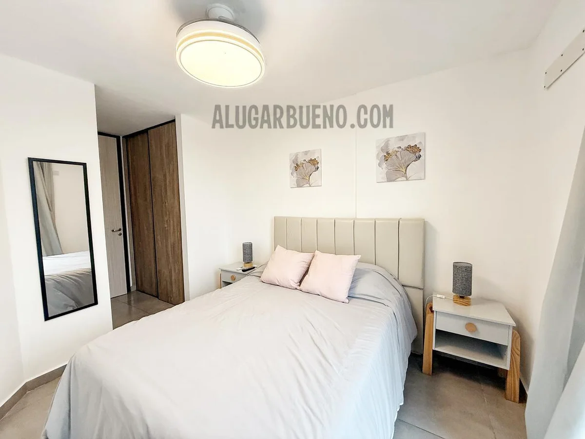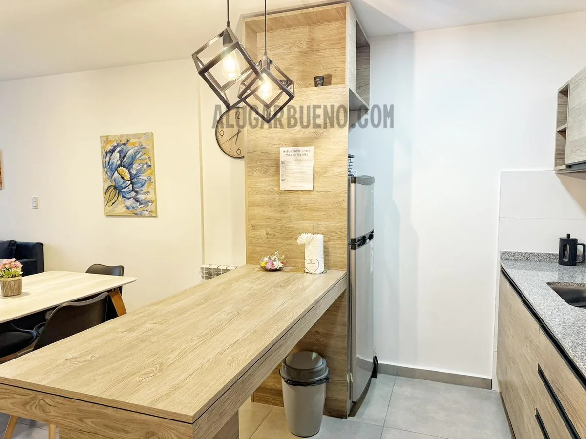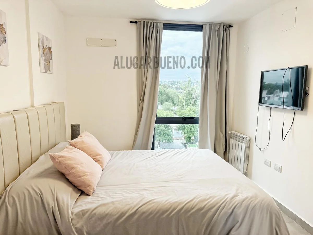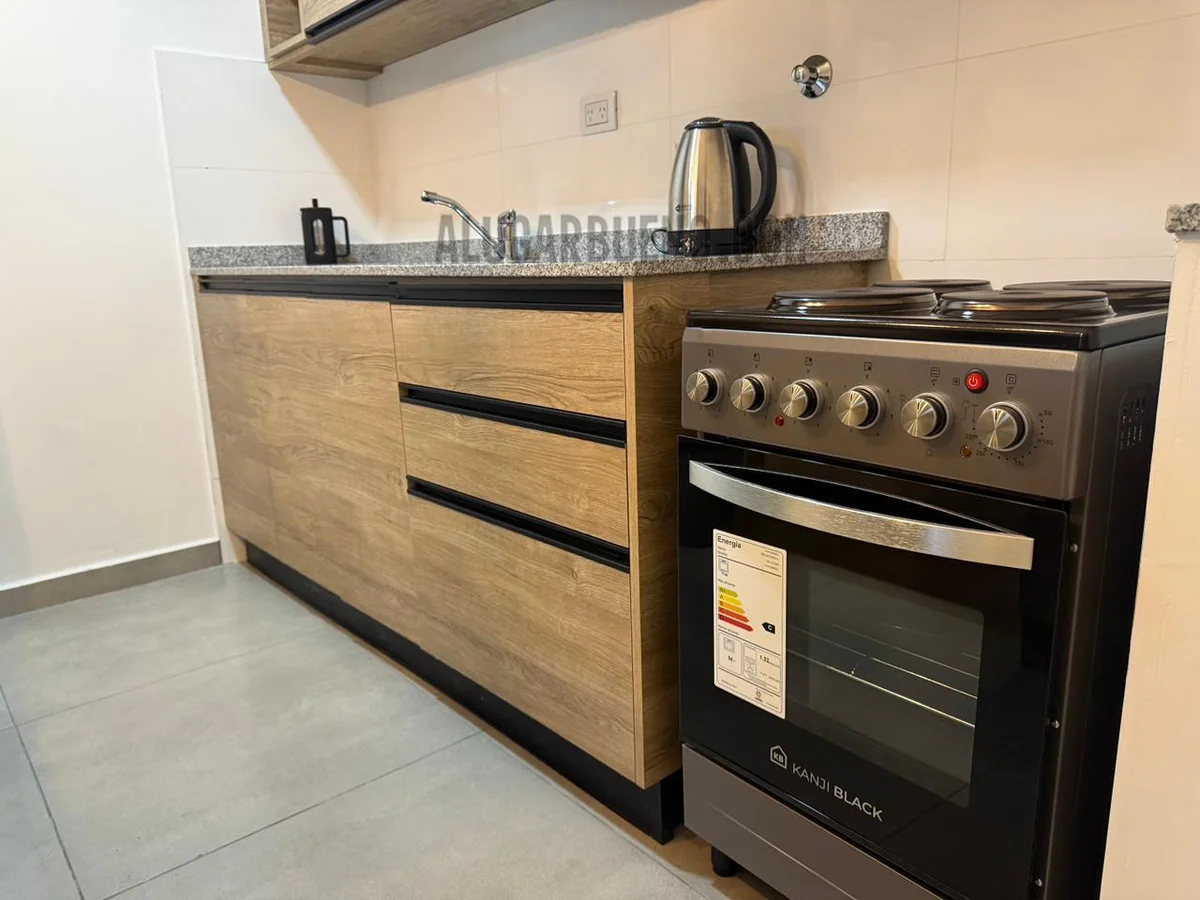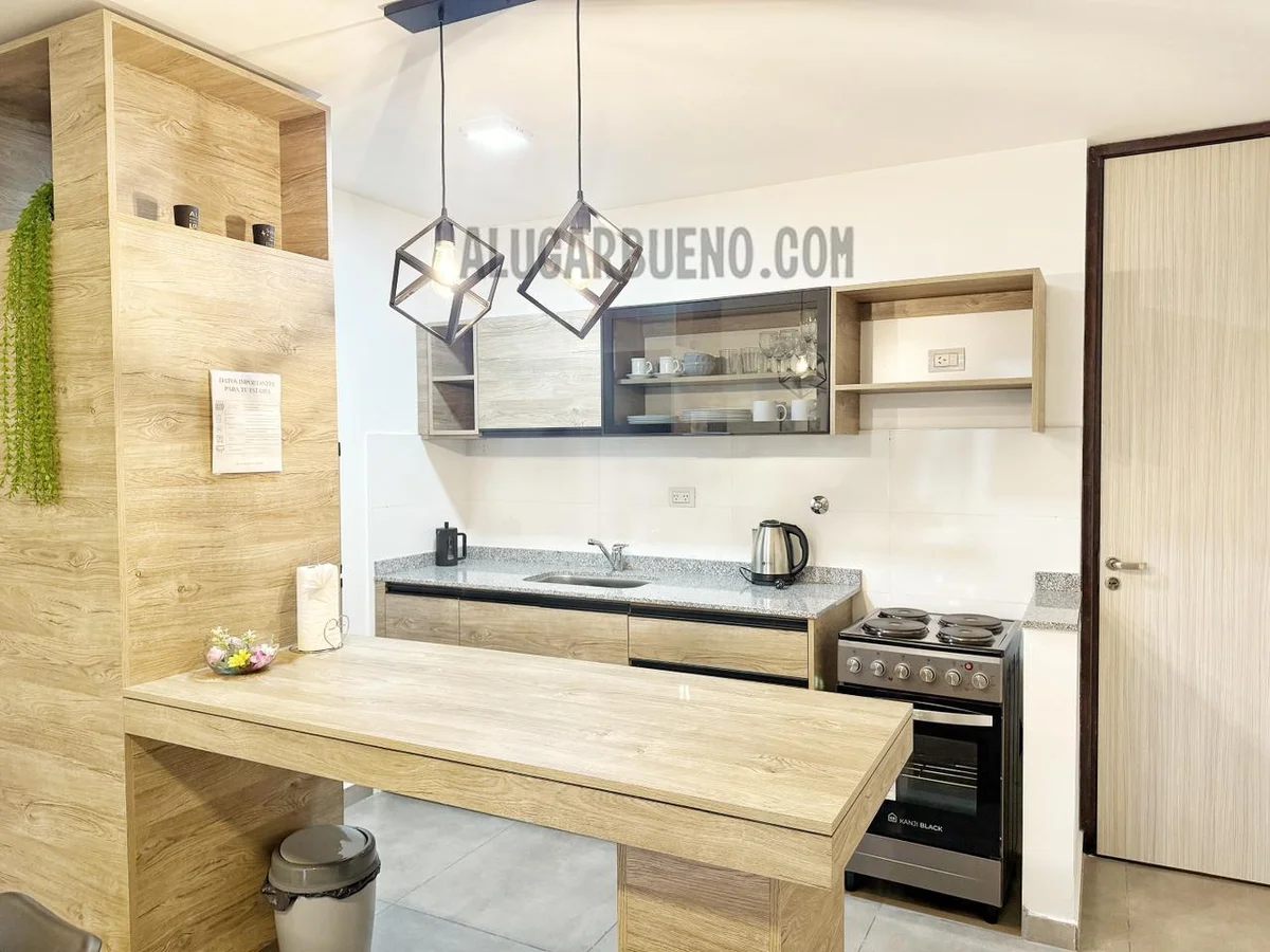 El departamento está ubicado en segundo piso con vistas a la ciudad. Posee living comedor equipado con aire, tv, muebles de cocina modernos con vajilla completa, cubiertos, asaderas, fuentes, pava, heladera, cocina con horno.